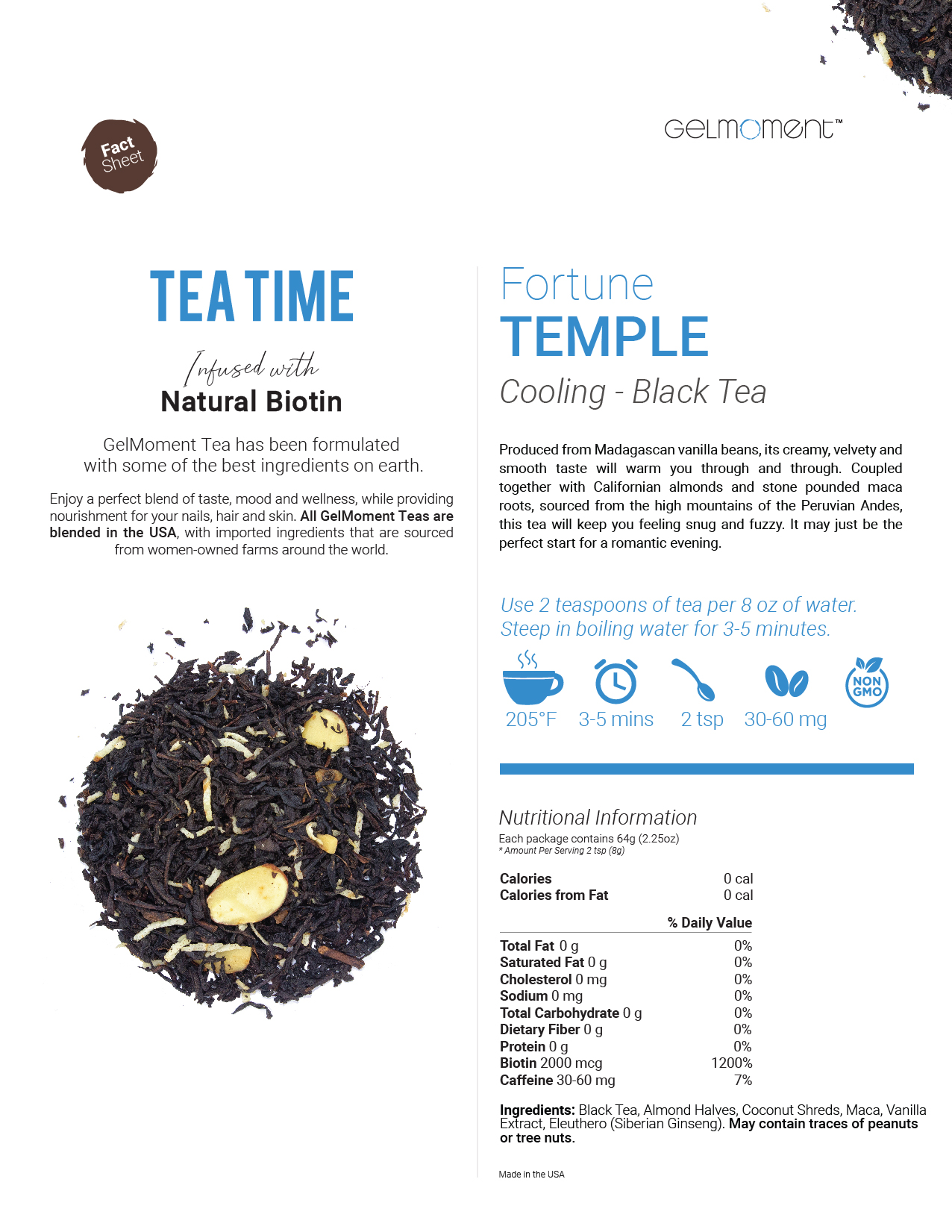 Black tea, almond halves, coconut shreds, maca, vanilla extract, eleuthero (Siberian ginseng).