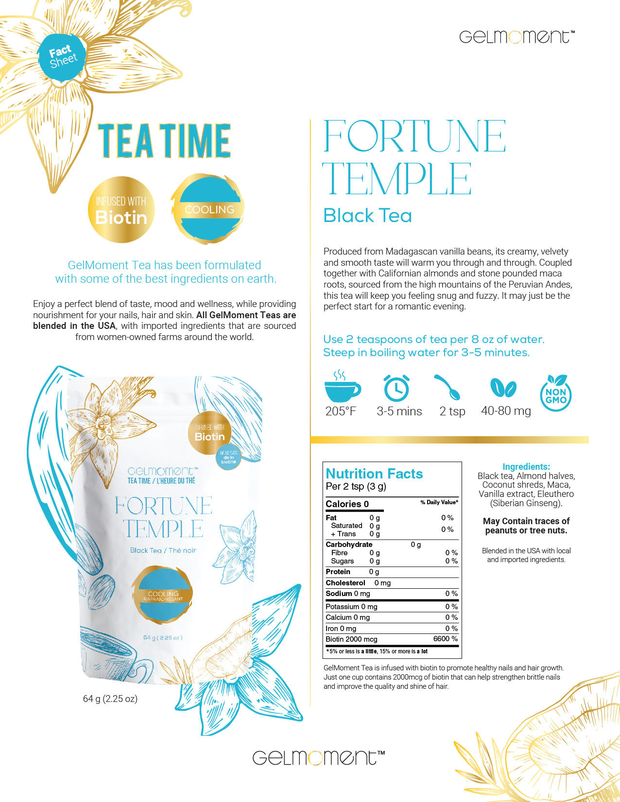 Produced from Madagascan vanilla beans, its creamy, velvety, and smooth taste will warm you through and through. Coupled together with Californian almonds and stone pounded maca roots, sourced from the high mountains of the Peruvian Andes, this tea will keep you feeling snug and fuzzy. It may just be the perfect start to a romantic evening.